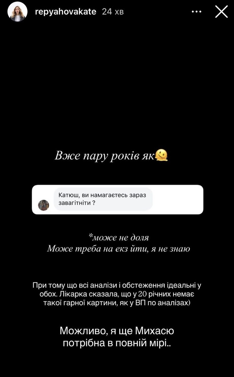 "Може, не доля. Може, треба на ЕКЗ йти, я не знаю. При тому, що всі аналізи і обстеження ідеальні в обох. Лікарка сказала, що у 20-річних немає такої гарної картини, як у ВП по аналізах. Можливо, я ще Михасю потрібна в повній мірі...", - додала Катерина.