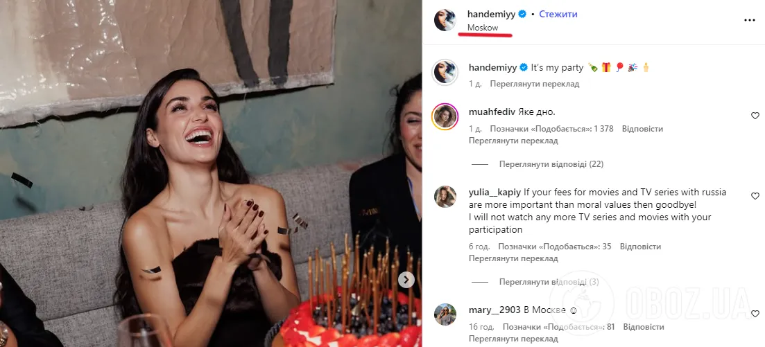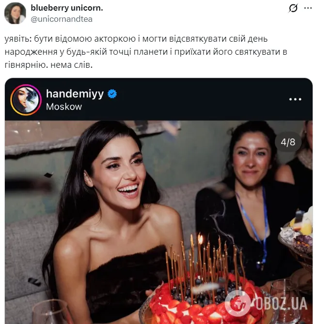 26 листопада Ханде Ерчел опублікувала у своєму профілі в Instagram фото, де вона задуває свічки на торті, з підписом "Це моя вечірка". Акторка не посоромилася прикріпити до допису геолокацію – Москва.