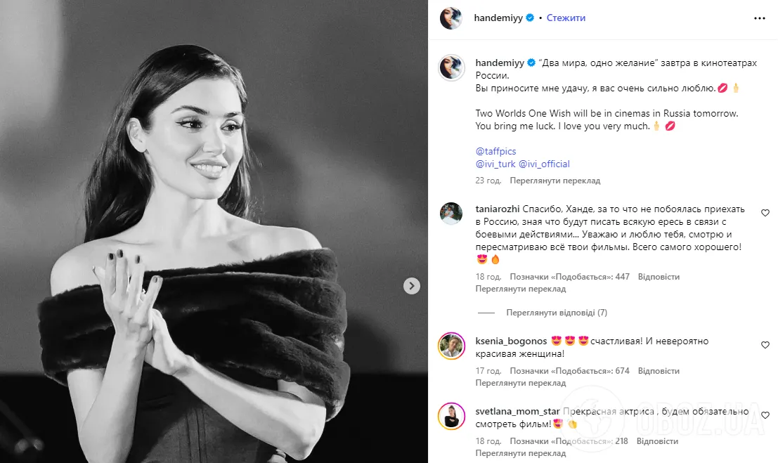 Турецька акторка Ханде Ерчел, зірка популярного серіалу "Постукай в мої двері", вкотре стала посміховиськом в Україні через свою політичну позиція. Причиною став її візит до Москви, де вона не лише представила свій новий фільм, але й відсвяткувала свій день народження, відкрито продемонструвавши свою байдужість до кровопролитної війни, яку Росія веде проти України, адже "гроші не пахнуть".