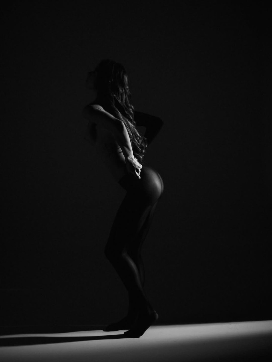Соня попозувала з оголеними грудьми та у чорних колготках на білому тлі.