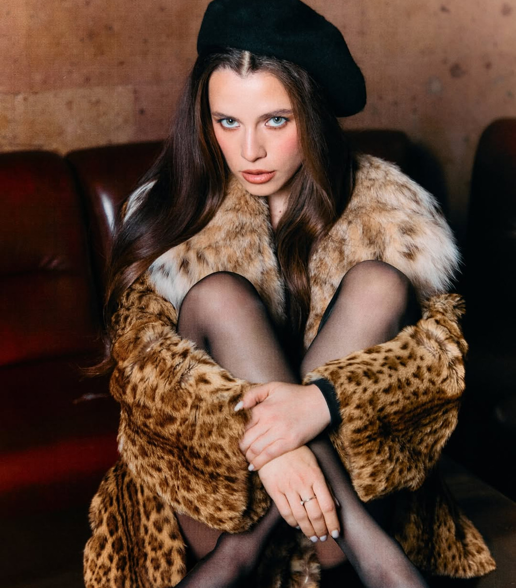 У своєму Instagram зірка показала кадри, на яких позує у шубі у хижий принт, колготках та береті.