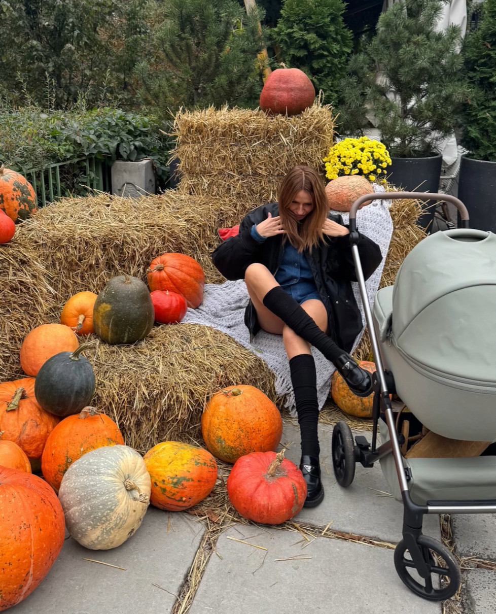 В Insta-сторіс знаменитість опублікувала кадр, на якому позувала біля осінньої локації з гарбузами в міні з деніму, курточці та чорних лоферах у поєднанні з панчохами. А дитячий візочок стояв поруч із матусею.