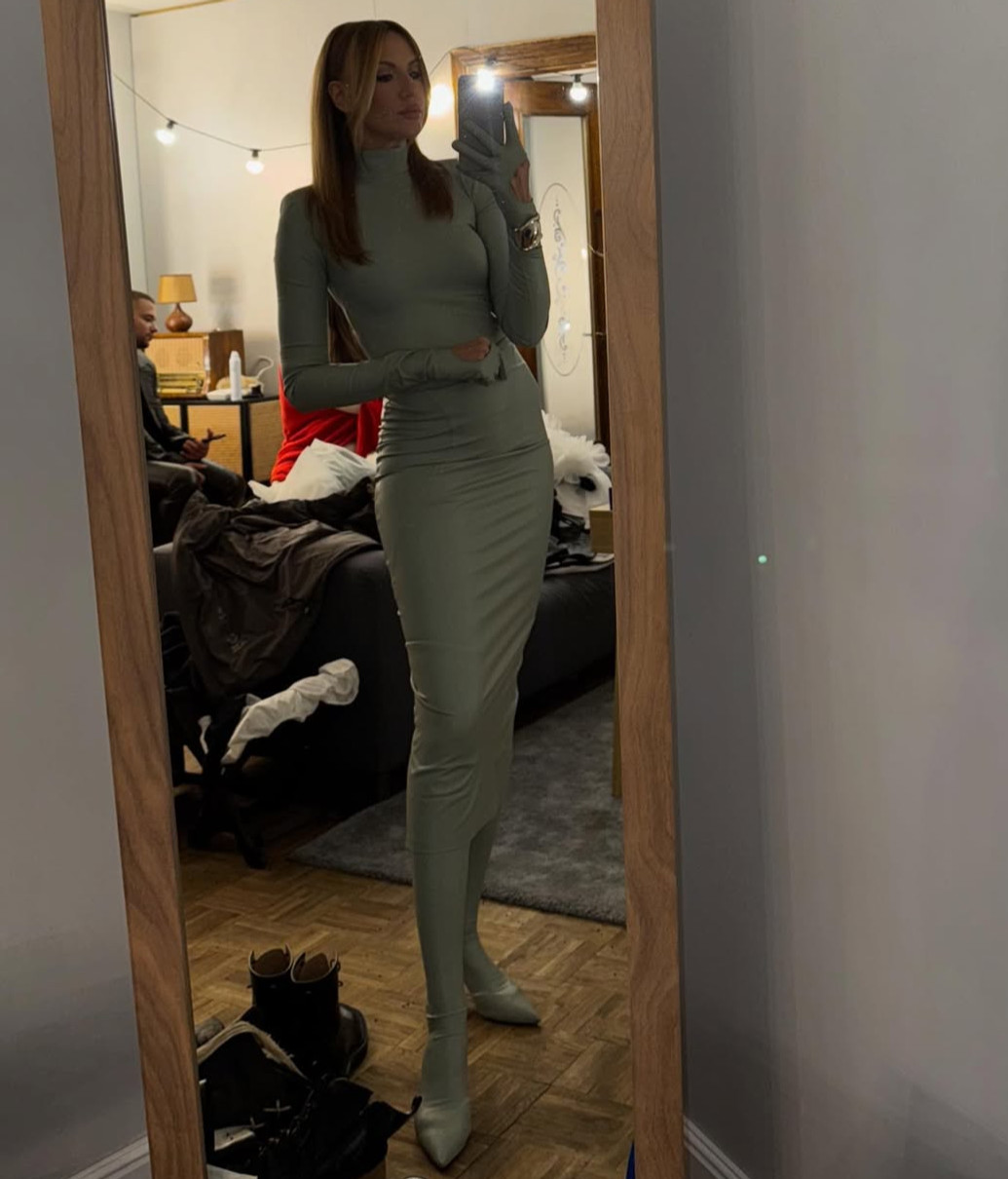 В Instagram знаменитість покрасувалася в обтислій шкіряній максісукні м'ятно-сірого кольору. На верх вона вдягнула білу хутряну накидку.