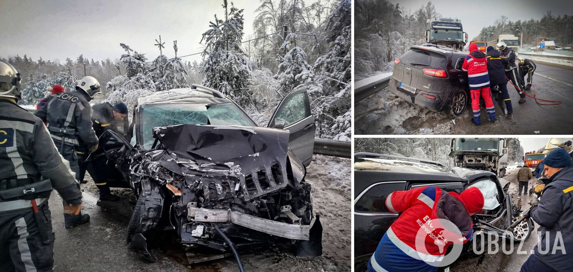 "По прибуттю на місце події встановлено, що сталася дорожньо-транспортна пригода за участю легкового автомобіля Jeep та вантажного автомобіля Volvo. Унаслідок ДТП пасажир автомобіля Jeep отримав травми різного ступеня тяжкості та перебував без свідомості в понівеченому транспортному засобі", – уточнили в ДСНС.
