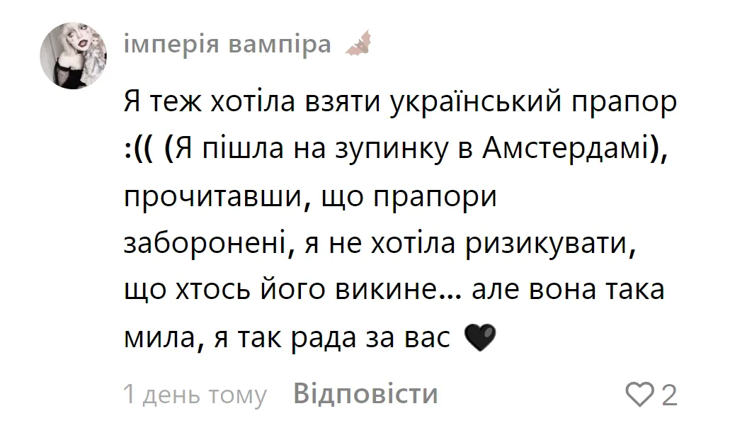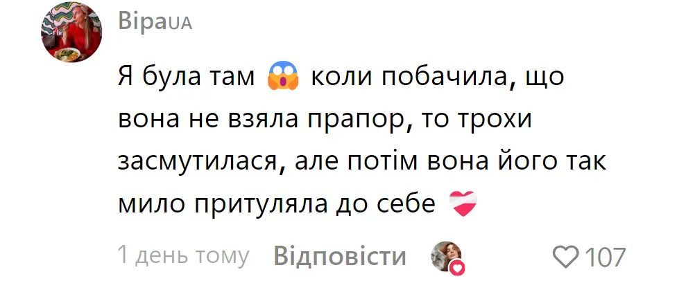 У коментарях під роликом у TikTok одна з очевидців поділилася власними враженнями: "Я була там. Коли побачила, що вона не взяла прапор, то трохи засмутилася, але потім вона його так мило притуляла до себе".