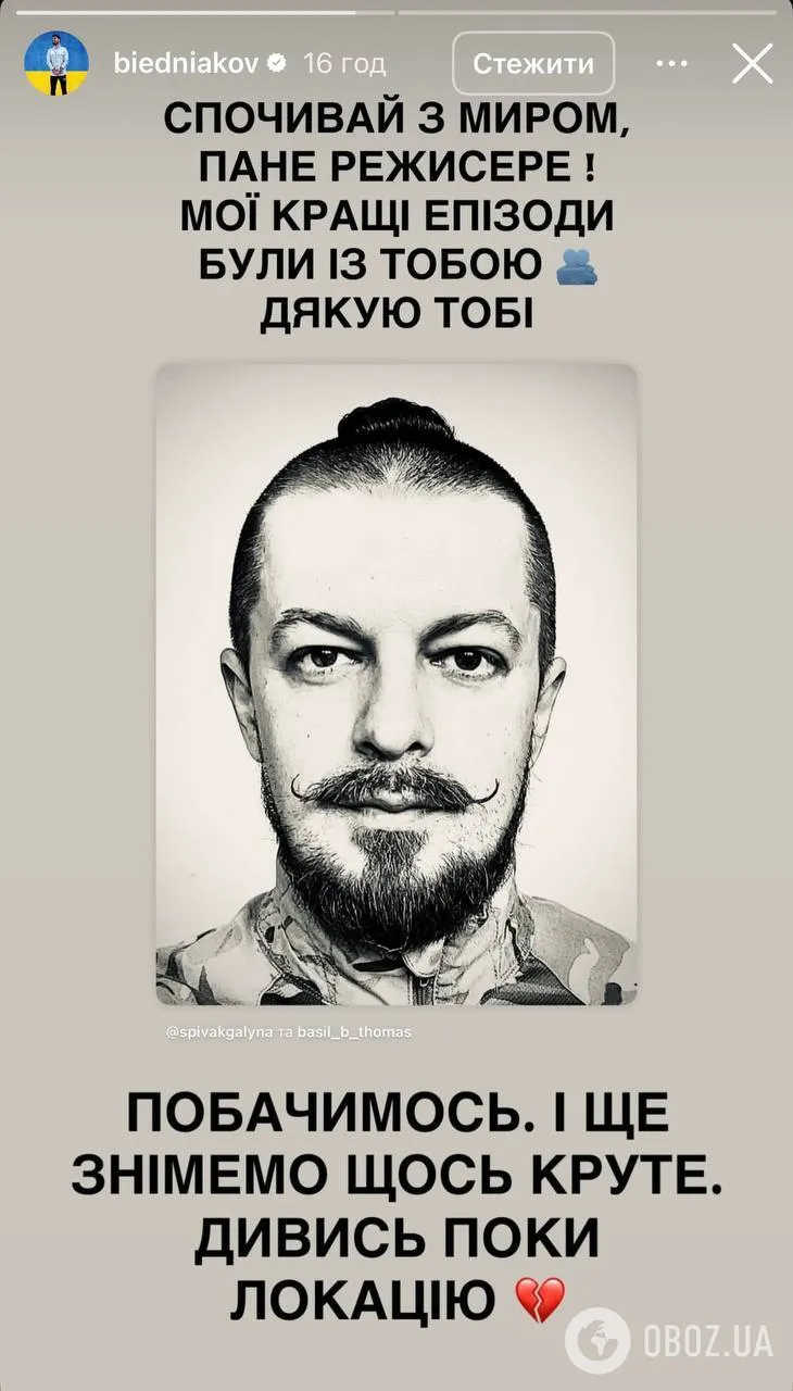 "Спочивай з миром, пане режисере! Мої найкращі епізоди були з тобою. Дякую тобі. Побачимося і ще знімемо щось круте. Дивися поки локацію", – зазначив ведучий.