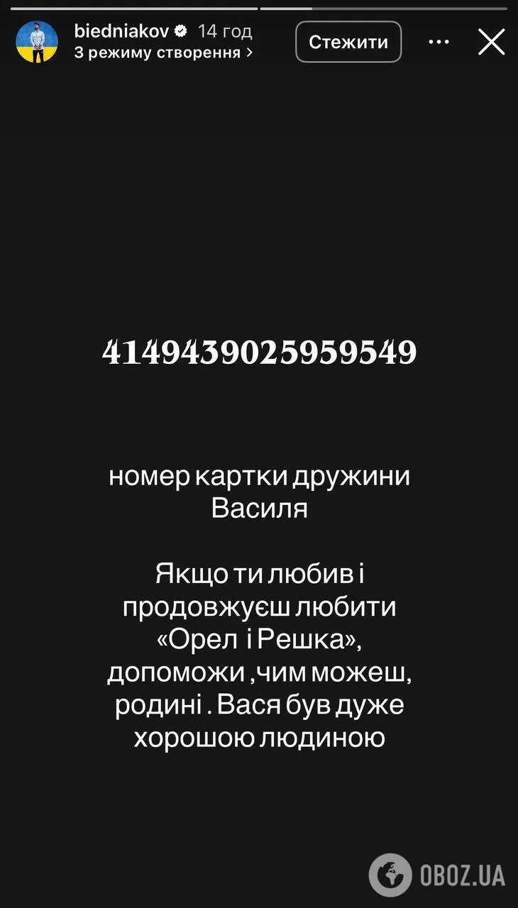 Окрім того, Бєдняков звернувся до всіх фанатів "Орла і Решки" із проханням підтримати родину полеглого захисника. Він залишив номер карти Галини Співак, аби охочі мали змогу допомогти фінансово.