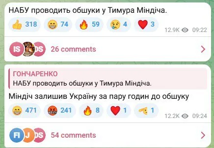 Вранці 10 листопада детективи Національного антикорупційного бюро України прийшли з обшуками до співвласника студії "Квартал 95" та бізнесмена Тимура Міндіча. Також відомо, що аналогічний візит зробили до Міністра Юстиції Германа Галущенка.