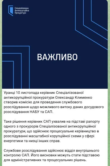 Як зазначають у пресслужбі САП, 10 листопада керівник Олександр Клименко створив комісію для службового розслідування можливого витоку даних досудового розслідування справи. Члени комісії мають з'ясувати обставини поширення інформації, яка стосується кількох кримінальних проваджень.