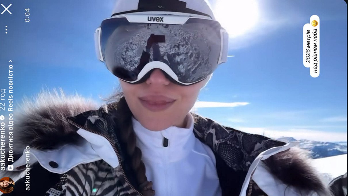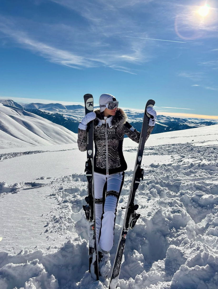 Кучеренко попозувала у біло-чорному з хижим принтом лижному костюмі на вершині гори, звідки відкривався неймовірний вид.