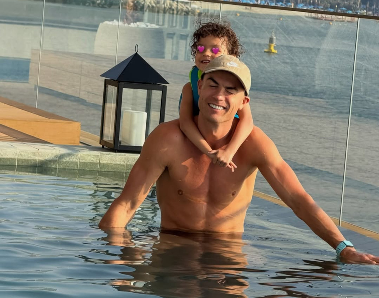 У себе в Instagram обраниця спортсмена опублікувала чималу добірку спогадів з їхнього відпочинку. На одному з кадрів Кріштіану показався в басейні з молодшою донечкою, 3-річною Беллою Есмеральдою у себе на спині.