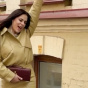 На кадрах Іванна у стильному жовто-оливковому костюмі: об'ємній куртці та спідниці довжини міді. Образ вона доповнила нюдовими туфлями на підборах та коричневим клатчем.