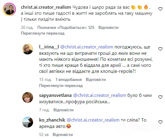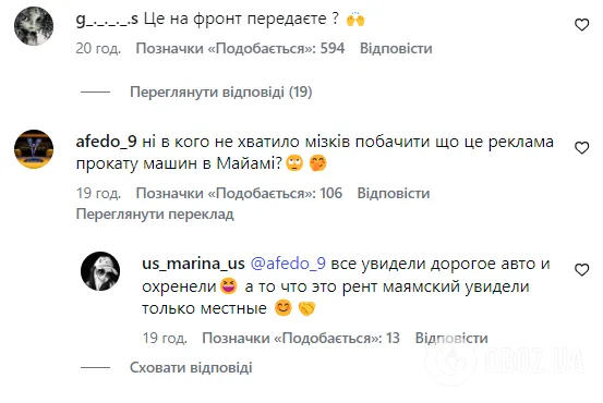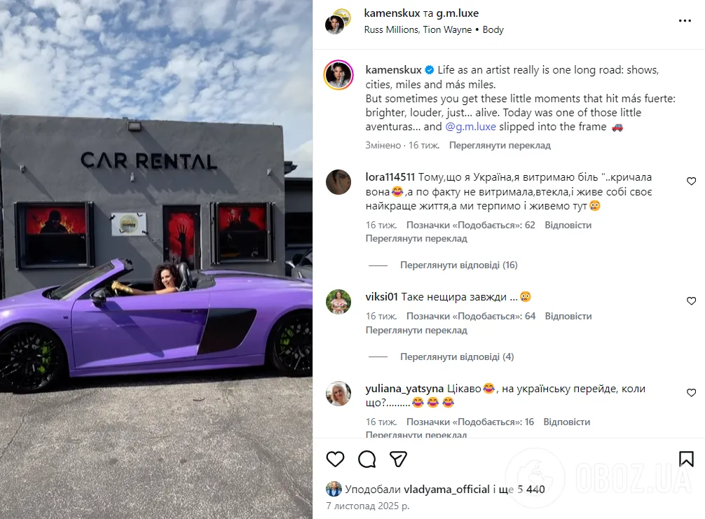 Хоча деякі користувачі привітали співачку з дорогою покупкою, уважні шанувальники швидко помітили нюанс: автомобіль орендований. Каменських у своєму пості позначила два акаунти: один, який надає послуги оренди елітних автомобілів у Маямі, США, другий – його власниці-українки.