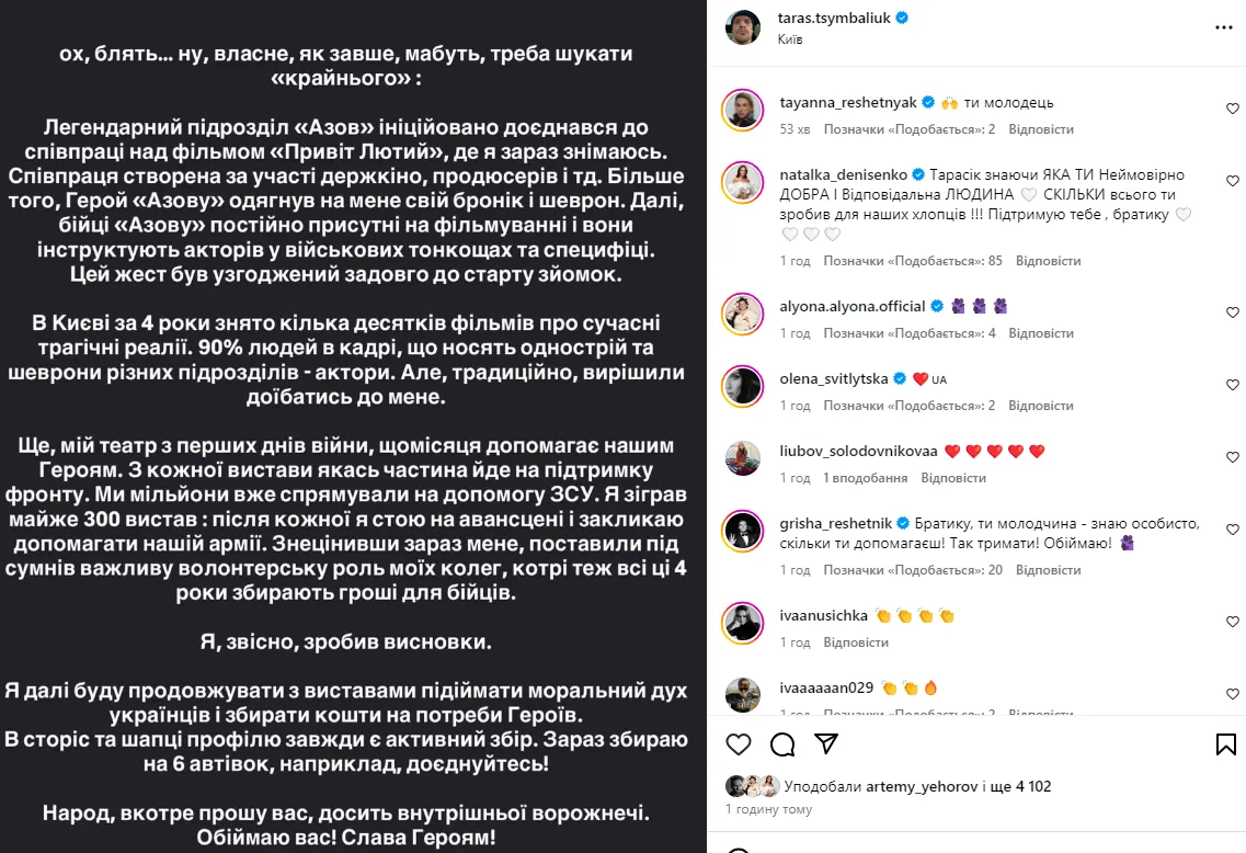 "Ох, бл*ть... Ну, власне, як завжди, мабуть, треба шукати "крайнього", – написав Цимбалюк в Instagram, пояснивши, що саме бійці "Азову" надали йому бронежилет і шеврон, а також консультують акторів на знімальному майданчику. Він наголосив, що десятки фільмів в Україні знімають про сучасні реалії війни, і більшість акторів у кадрі грають у формі. Проте нібито саме його вирішили звинуватити в "недостойності".