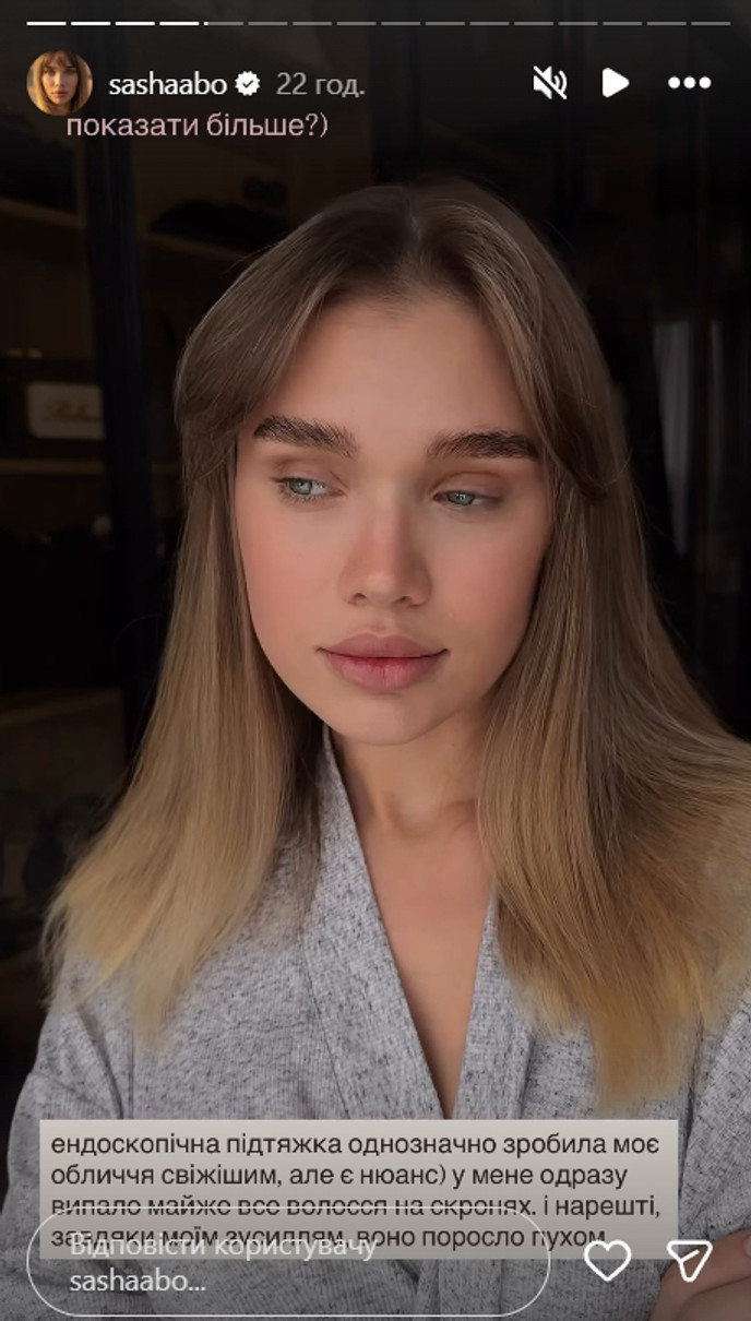 Блогерка Саша Бо (Олександра Тарнавська), яка восени минулого року зробила ендоскопічну підтяжку середньої та нижньої третини обличчя, розповіла, з якими несподіваними наслідками зіштовхнулася після операції.