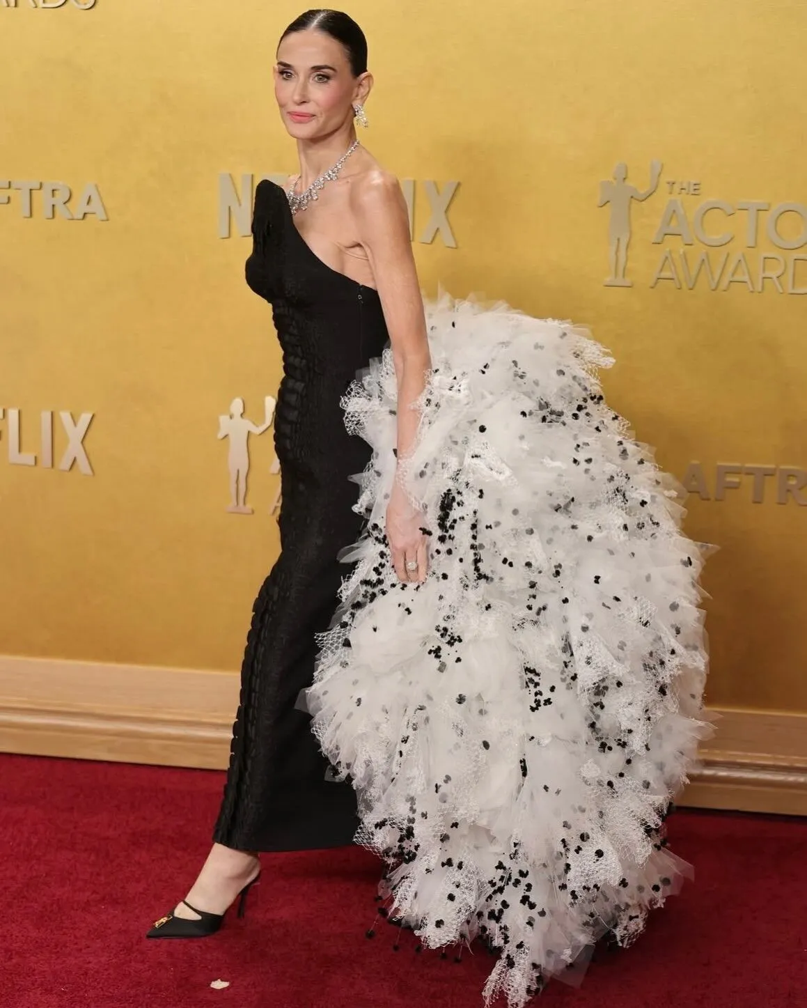 На захід Мур прийшла у кутюрній чорній сукні від Schiaparelli із пір'ям. Образ доповнили діаманти від Harry Winston загальною вагою понад 95 каратів, повідомляє inkl. Волосся акторка зібрала у тугий пучок, через що оголила свої худі плечі.