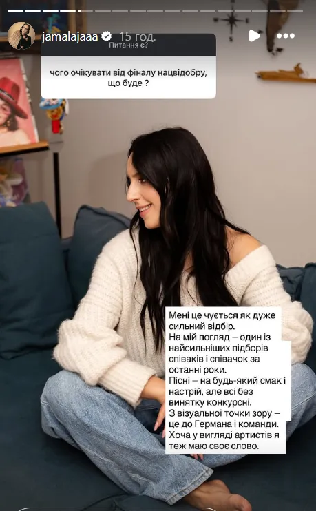Про це співачка розповіла в InstaStories, коментуючи перебіг підготовки до Нацвідбору. Джамала зазначила, що майже всі представлені композиції відповідають вимогам міжнародного конкурсу, а візуальна складова перебуває під контролем режисера Германа Нєнова та його команди.