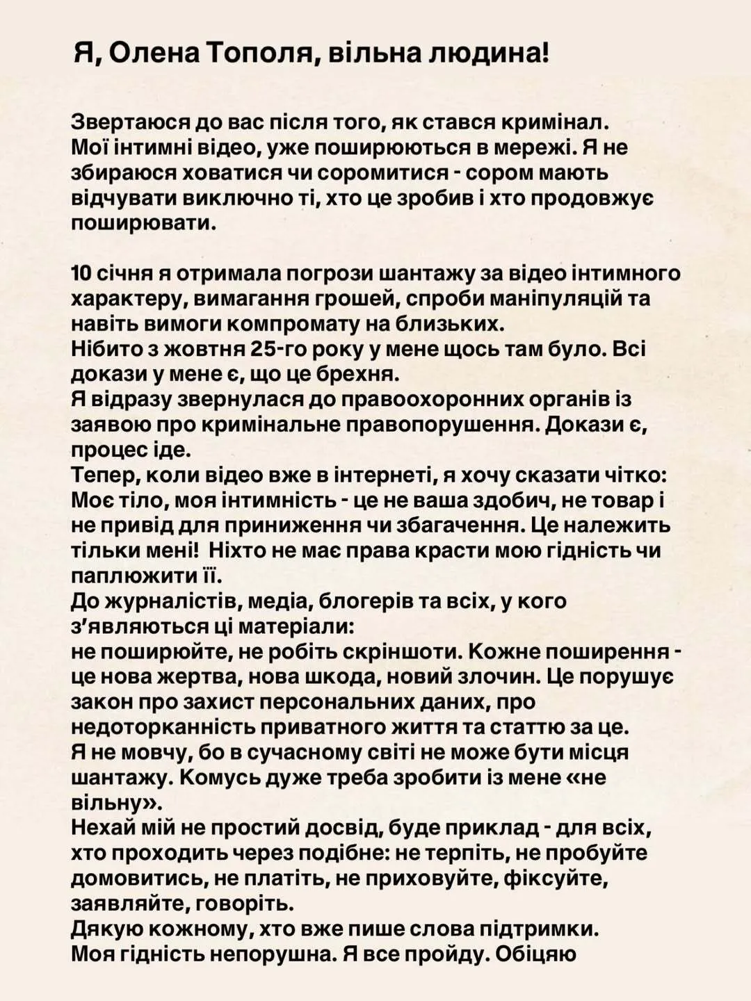 Олена Тополя наголосила, що не дозволить нікому паплюжити свою честь, тож звернулася до правоохоронних органів. Згодом стало відомо, що поліція затримала 23-річного мешканця Києва, який шантажував співачку. Йому оголосили про підозру за ч. 5 ст. 27, ч. 4 ст. 189 (вимагання) Кримінального кодексу України. Чоловіку загрожує покарання у вигляді позбавлення волі на 12 років.