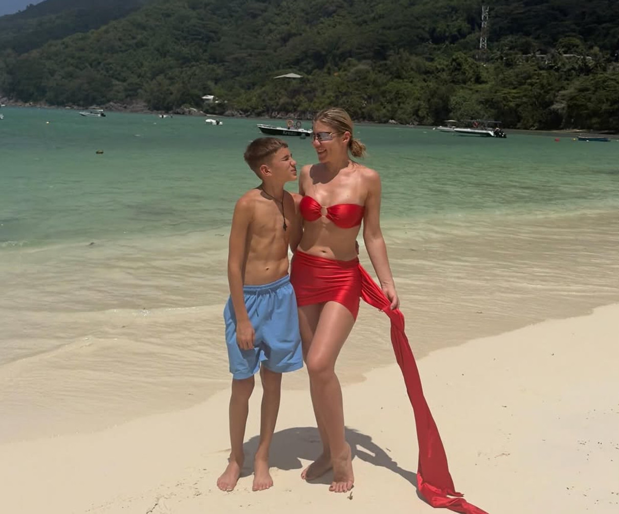 В Instagram знаменитість показалась на пляжі у полум'яному купальнику, який доповнювався мініспідничкою зі шлейфом в тон. На одному зі знімків коло Альони позував її син Тимур.