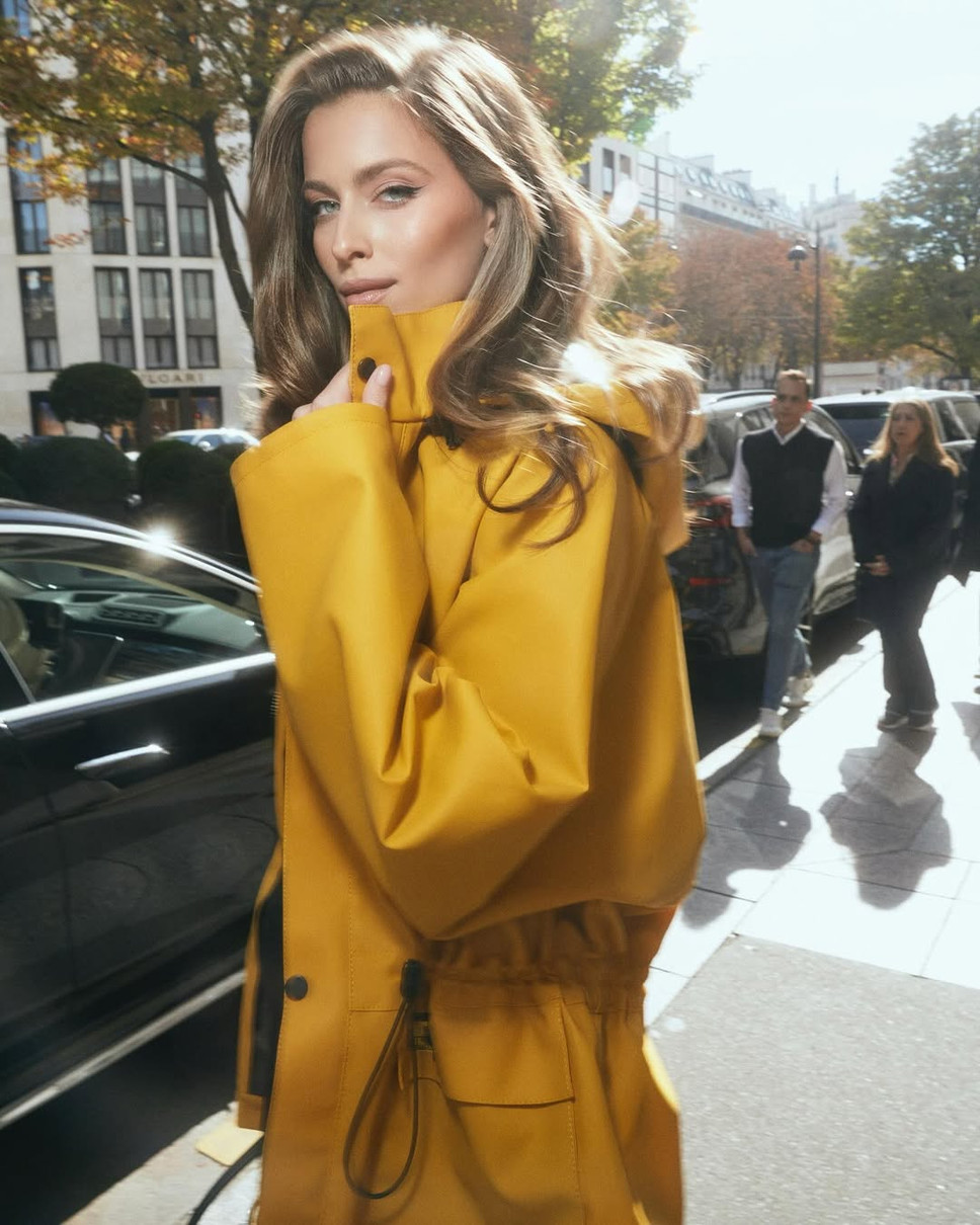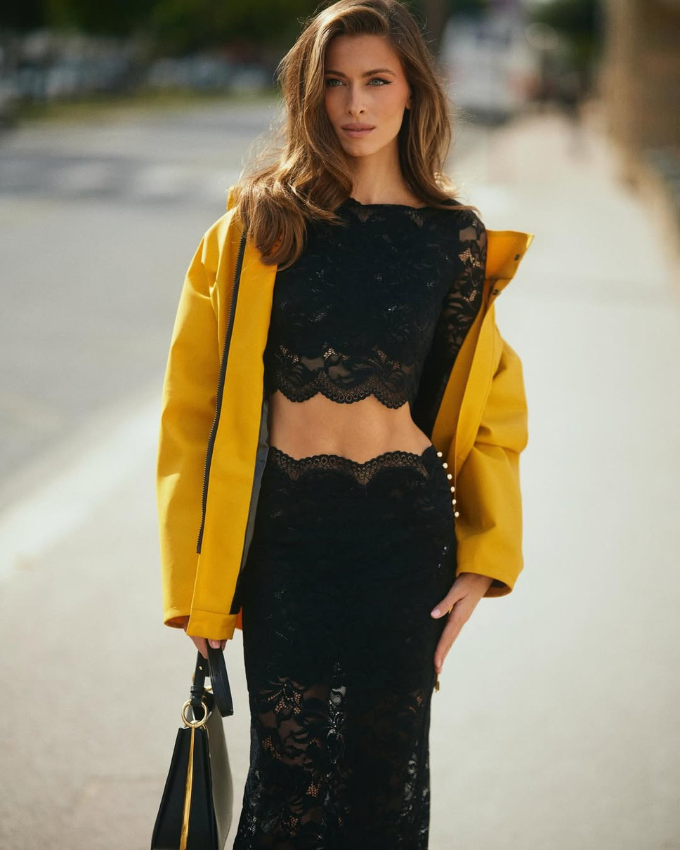 Софія у чорному мереживному топі та спідниці довжини міді від французького бренду Rabanne прогулялася вулицями. Свій образ вона доповнила яскравою жовтою курткою та чорною сумкою цього ж бренду.