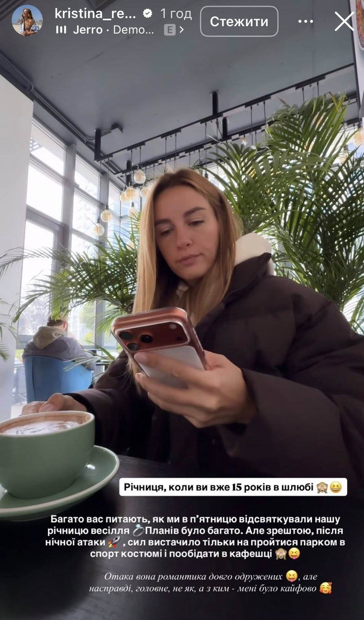 "Річниця, коли ви вже 15 років в шлюбі. Багато вас питають, як ми в п'ятницю відсвяткували нашу річницю весілля. Планів було багато. Але зрештою, після нічної ракетної атаки, сил вистачило тільки на пройтися парком в спорткостюмі і пообідати в кафешці", - зізналася Христина.