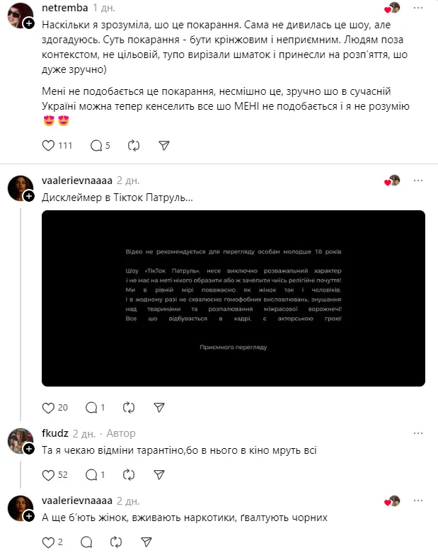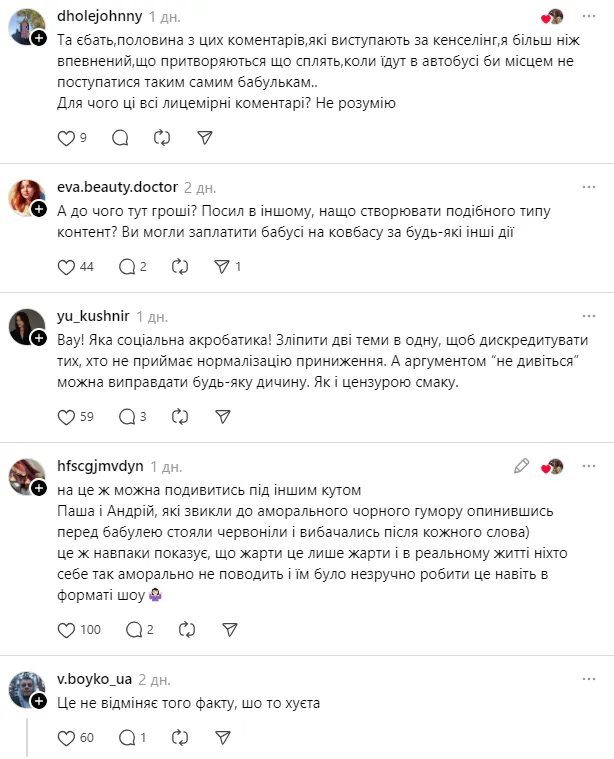Думки українців у коментарях розділилися на два табори. Частина користувачів підтримала коміків, називаючи хейтерів лицемірами, які "вдають, що сплять в автобусі, аби не поступатися місцем". Інші ж вважають, що наявність гонорару не виправдовує створення контенту, який базується на образах літніх людей, та називають такі пояснення "соціальною акробатикою".