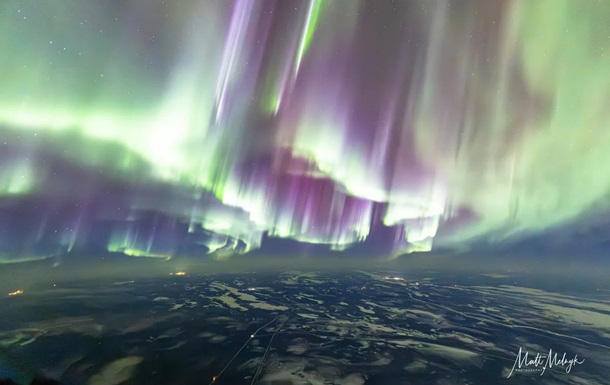 Пілот сфотографував різнобарвні переливи над провінцією Манітоба, Гудзоновою затокою та островом Баффіна. З такої висоти сяйво виглядало яскравішим, чіткішим і масштабнішим, ніж із землі, де огляду заважають хмари та міське світлове забруднення.