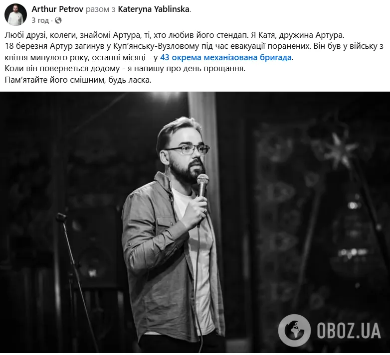 Трагічну новину повідомила дружина гумориста Катерина у соціальній мережі Facebook. За її словами, Артур Петров доєднався до війська у квітні 2025 року, а останні місяці проходив службу у складі 43-ї окремої механізованої бригади Збройних сил України.