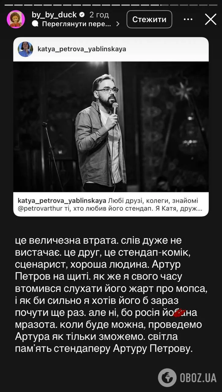 "Це величезна втрата. Слів дуже не вистачає. Це друг, це стендап-комік, сценарист, хороша людина. Артур Петров на щиті. Як же я свого часу втомився слухати його жарт про мопса, і як би сильно я хотів його б зараз почути ще раз. Але ні, бо Росія йо**на мразота".