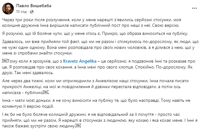 У відповідь Павло Вишебаба опублікував окремий допис у Facebook, де виклав власну версію подій. Він зазначив, що минуло три роки після розлучення, перш ніж у нього з’явилися серйозні стосунки, і зізнався, що йому прикро бачити, як особисті образи виносяться на публіку.