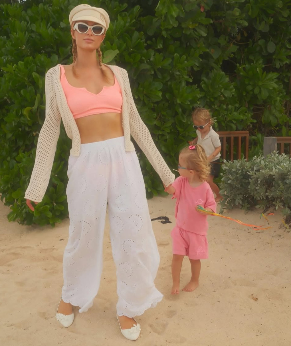 Для пляжних веселощів Періс вдягнула легкі штанці, рожевий топ і плетений кардиган