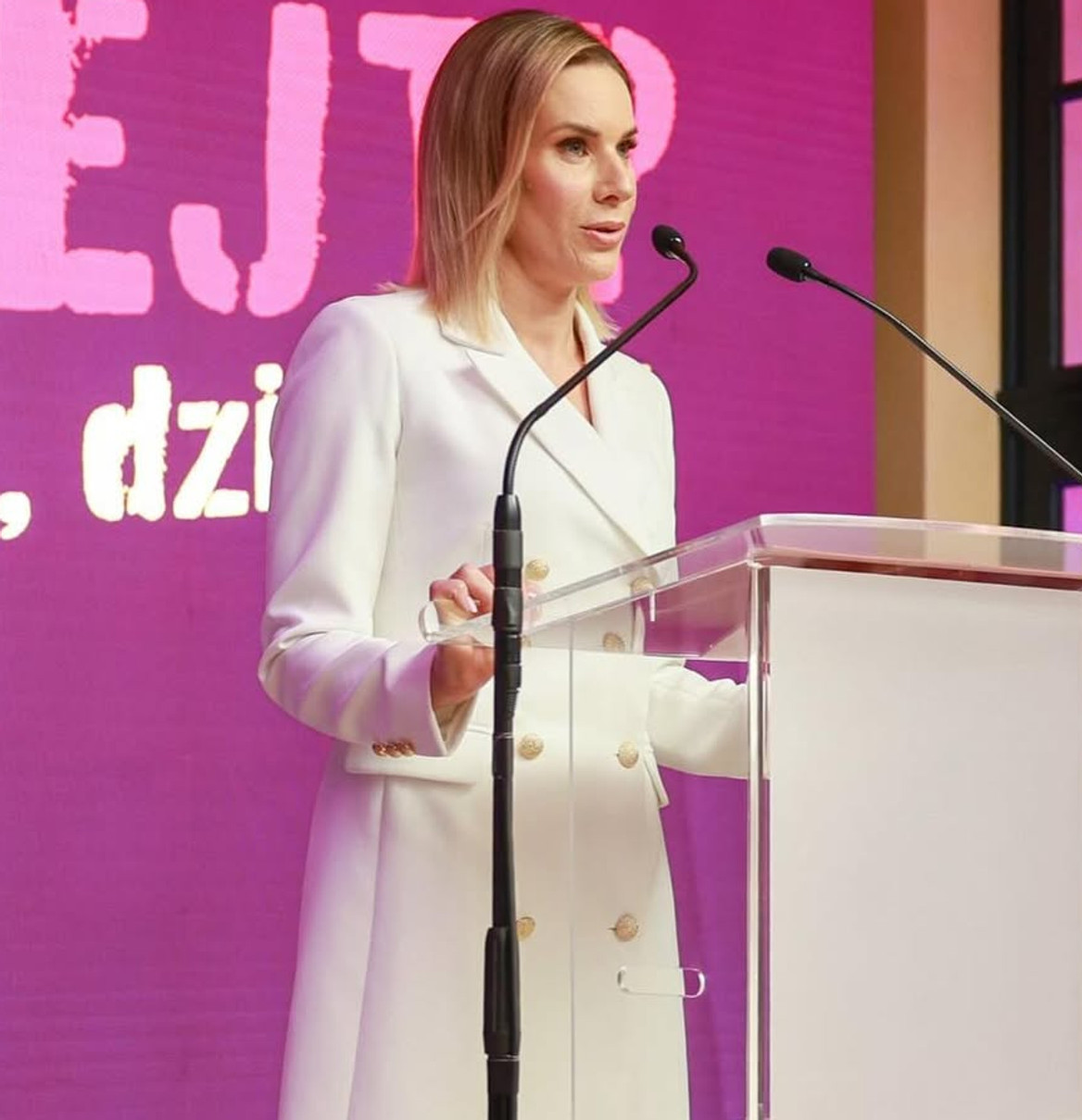 Для події в місті Вісла Навроцька вдягнула ефектну коротку сукню білого кольору, яка нагадувала подовжений блейзер. Вбрання також мало золоті ґудзики. До речі, цей лук вона вирішила пожертвувати на благодійність.