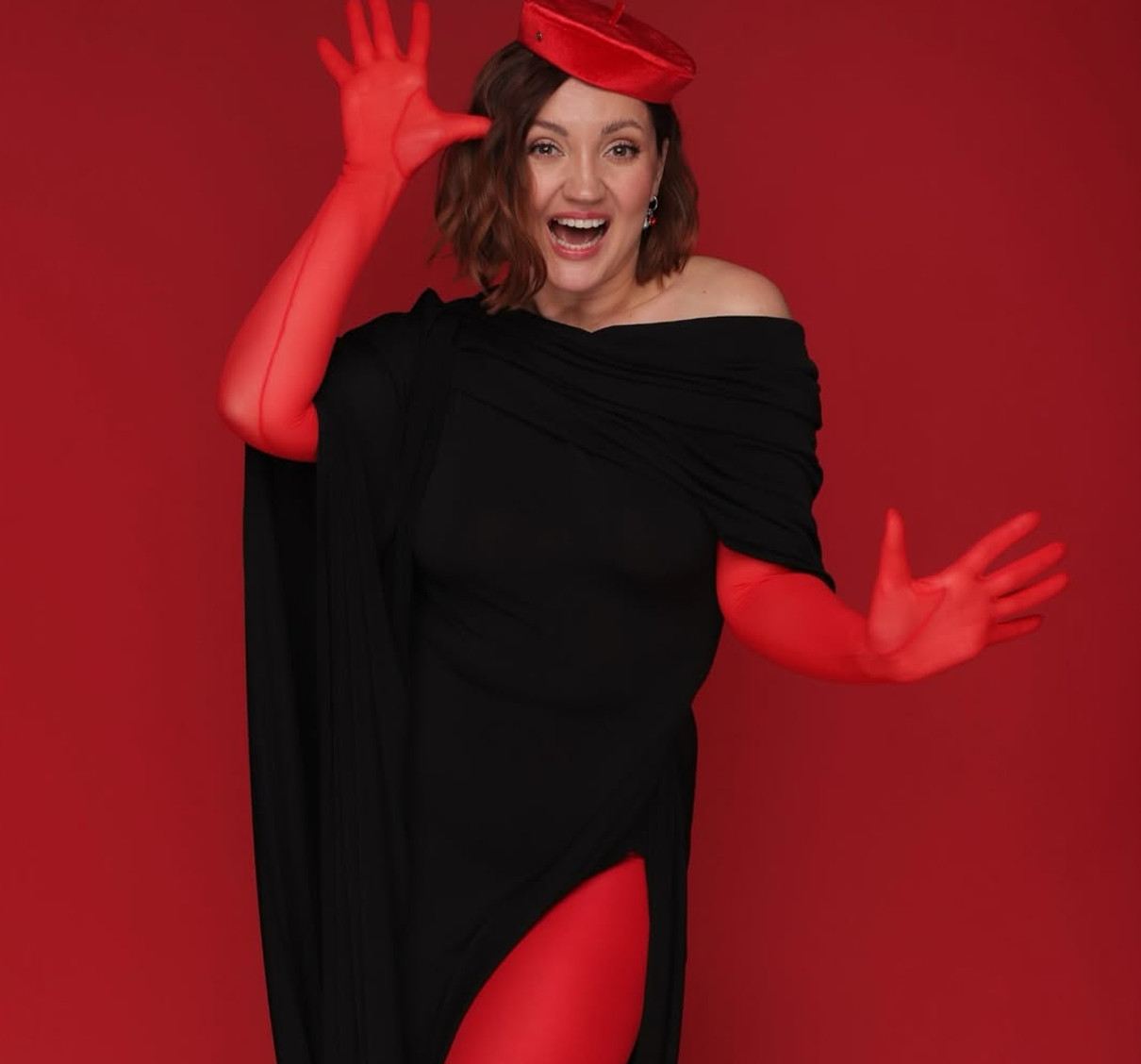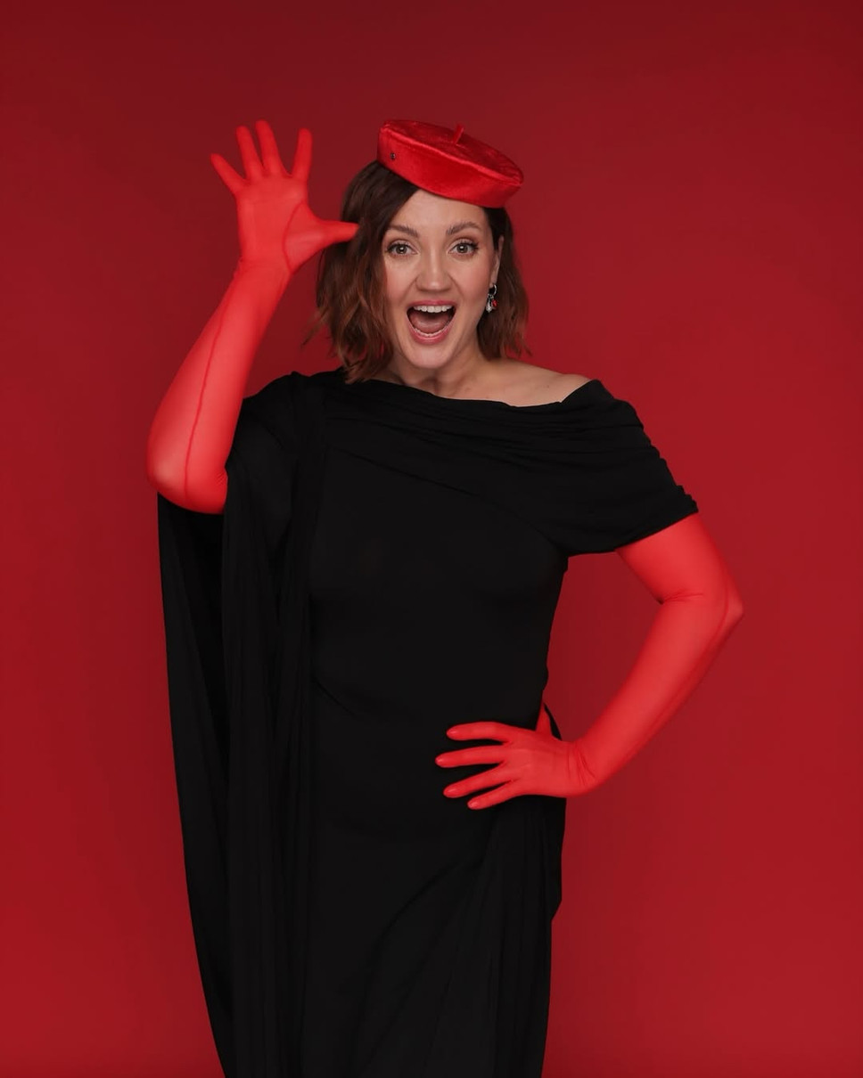 Оля попозувала на червоному тлі у чорній сукні-балахоні з розрізом, червоних колготках, береті та рукавичках.