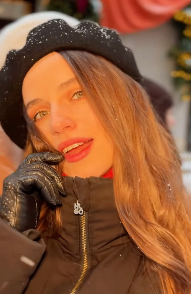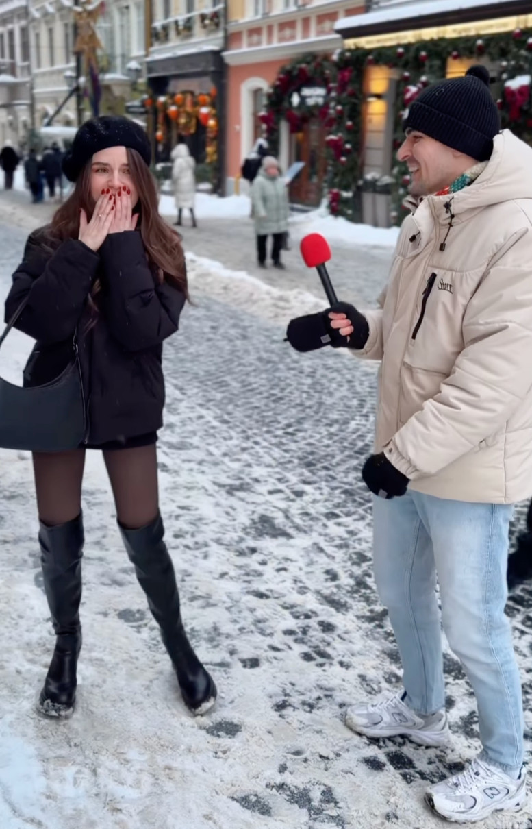 Блогер Ніколас Карма зустрів знаменитість на засніженій вулиці у грайливому міні, чоботах на підборах та береті, який нині в тренді.
