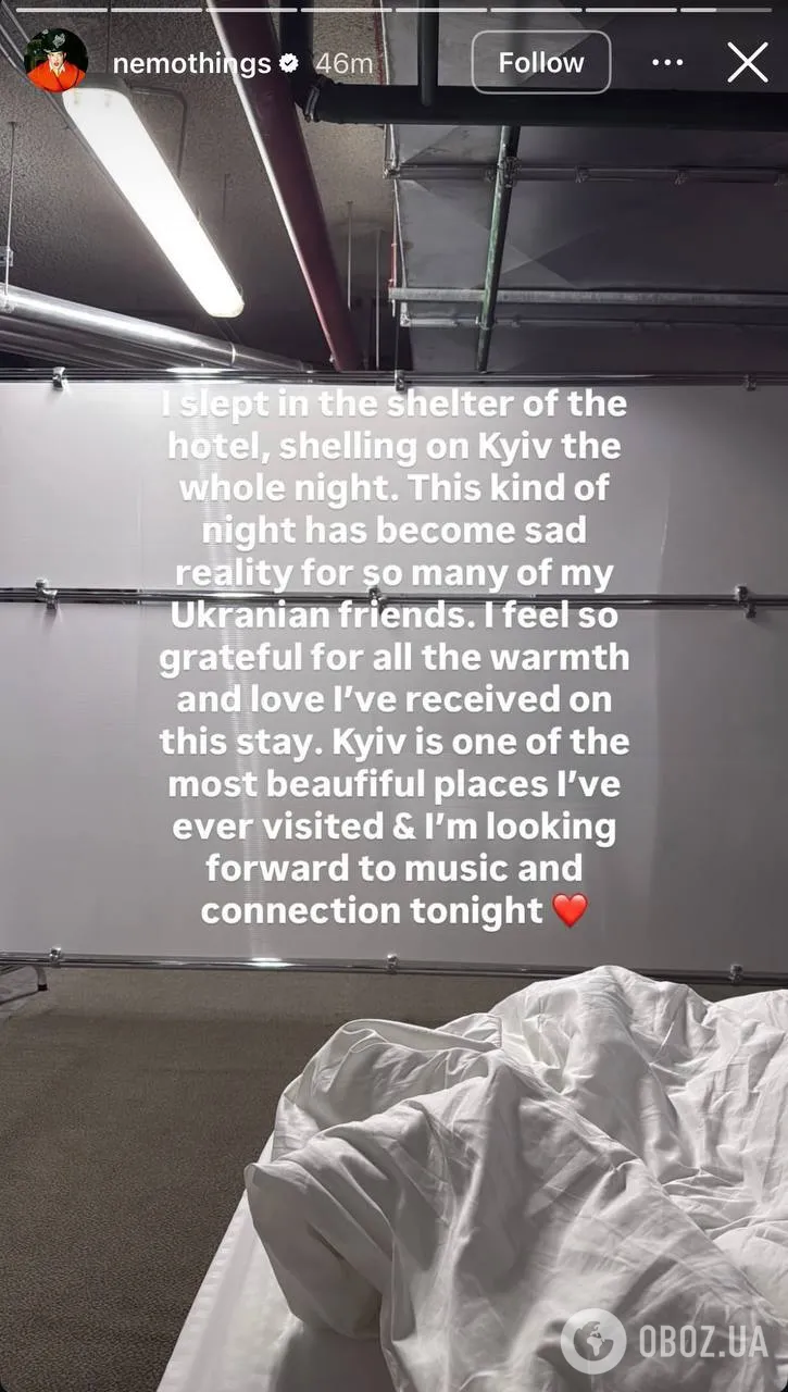"Ми спали в укритті готелю, а всю ніч тривав обстріл Києва. Такі ночі стали сумною реальністю для багатьох моїх українських друзів. Я дуже вдячний за всю теплоту і любов, які отримав під час перебування в укритті. Київ – одне з найгарніших місць, які я коли-небудь відвідував", – зазначили вони.