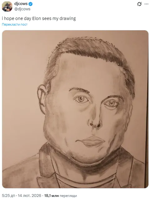 "Художник" оприлюднив незграбний, навмисно карикатурний портрет мільярдера: Ілона Маска зобразили у спрощеній манері з перебільшеними рисами обличчя. Чоловік зазначив, що мріє, аби засновник SpaceX побачив малюнок і навіть поставив його на аватар у X.