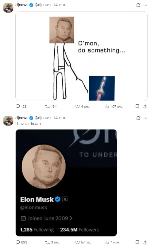 Після блокування "художник" почав активно створювати меми на основі власного портрета. Його мрія здійснилася частково – Маск таки звернув увагу на малюнок, хоч і у спосіб, на який автор, можливо, не розраховував.