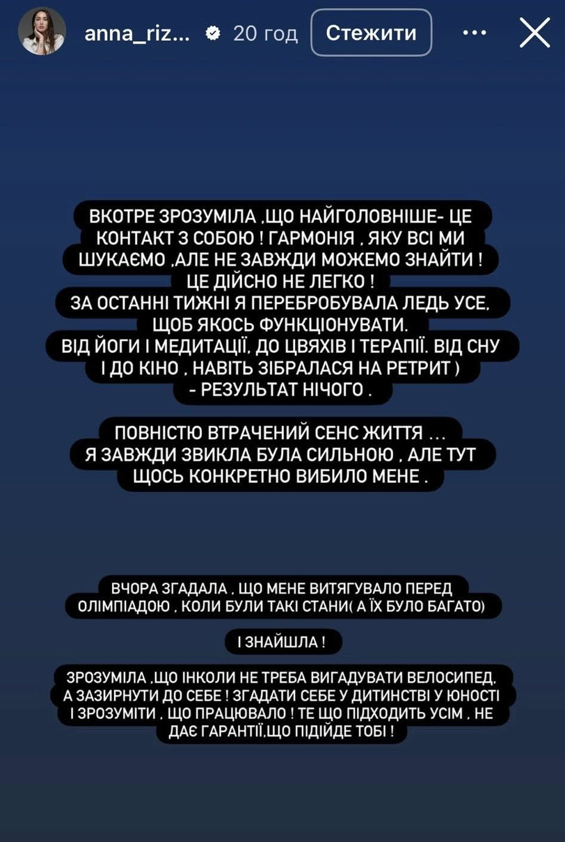 "Повністю втрачений сенс життя... Я завжди звикла бути сильною. Але тут щось конкретно вибило мене", - зазначила гімнастка.