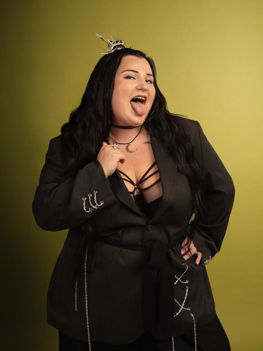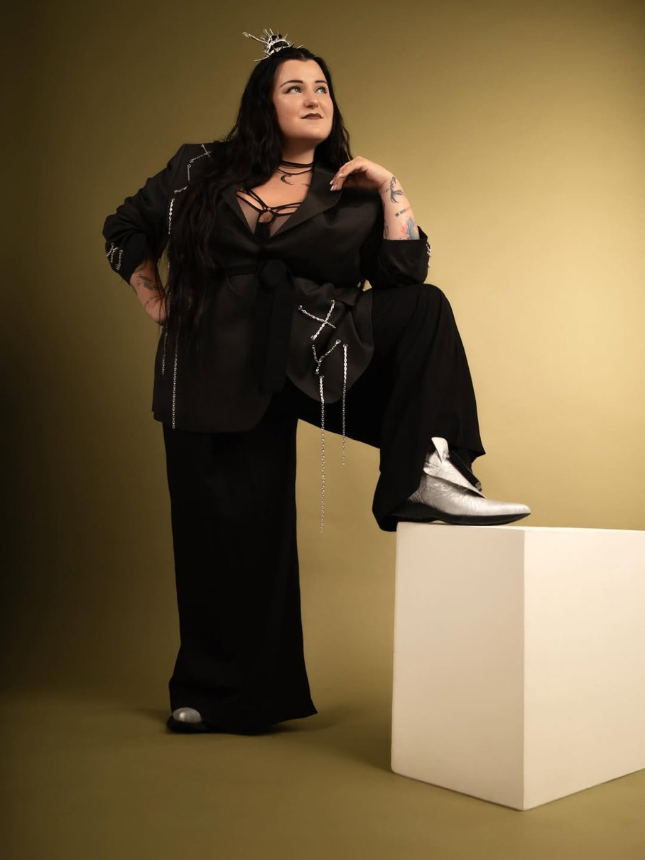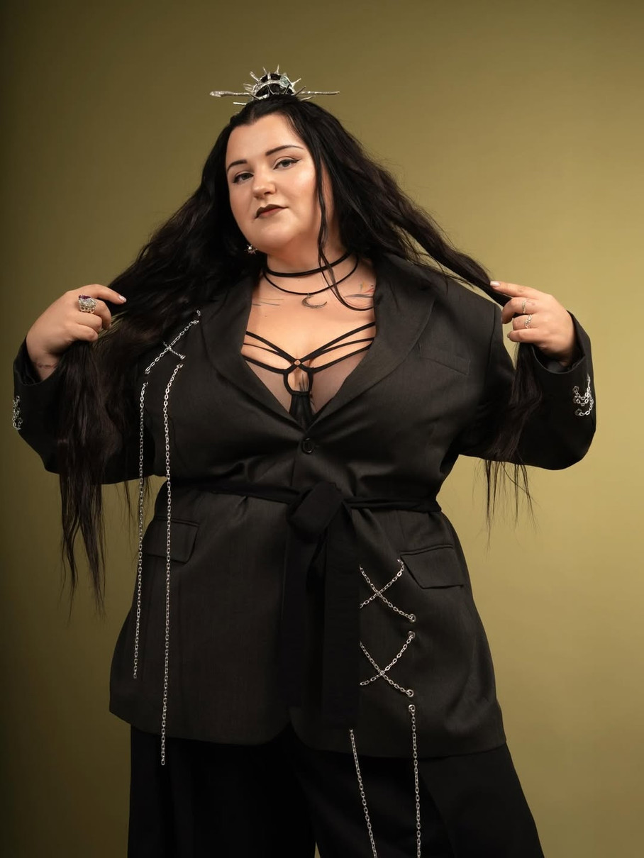 34-річна артистка постала перед камерою в чорних брюках в піджаку зі сріблястими ланцюжками. Під ним у Альони був бюстгальтер або боді з вигадливими шворками, а на голові - прикраса зі шпичаками, схожа на корону.