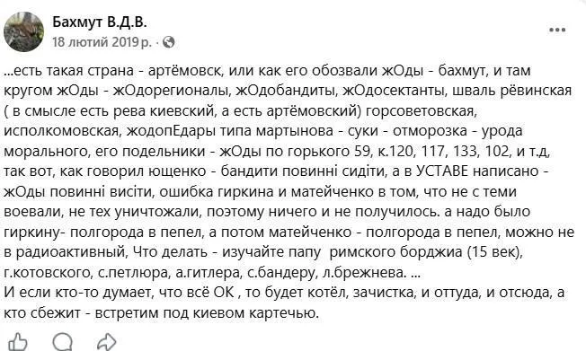 Зокрема, злочинець обурювався, що 2014 року його рідне місто Бахмут не було "стерте в попіл". У цьому контексті як кумирів і приклади для наслідування він перераховував кривавих диктаторів, включно з Адольфом Гітлером і Беніто Муссоліні, а також згадував середньовічні методи розправи.