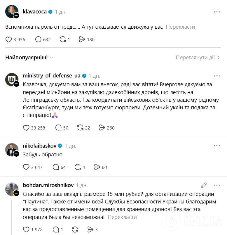 У відповідь на публікацію в офіційному стилі, але з іронією, представники Міноборони написали: "Клавочка, дякуємо вам за ваш внесок, раді вас вітати! Вчергове дякуємо за передані мільйони на закупівлю далекобійних дронів, що летять на Ленінградську область. І за координати військових обʼєктів у вашому рідному Єкатеринбурзі, туди ми теж готуємо сюрпризи. Доземний уклін та подяка за співпрацю!"