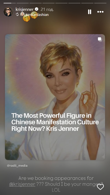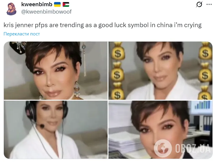 Інфлюенсерка, очільниця сім'ї Кардаш'ян і мільйонерка Кріс Дженнер несподівано стала символом успіху в китайських соцмережах, де її образ почали використовувати як своєрідний "талісман" для залучення багатства, кар’єрного зростання та успіхів у навчанні.