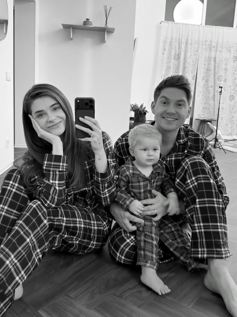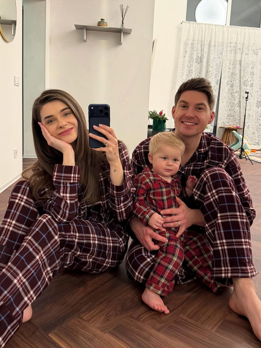 Катерина виклала селфі, на якому вони з чоловіком і сином Тімом позують у картатих бордових піжамах.