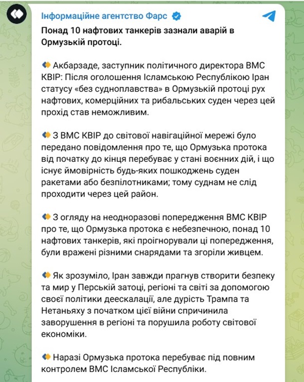 Нагадаємо, в КВІР заявили, що Ормузька протока відтепер "закрита", а Іран відкриватиме вогонь по будь-якому судну, яке спробує пройти цим маршрутом.