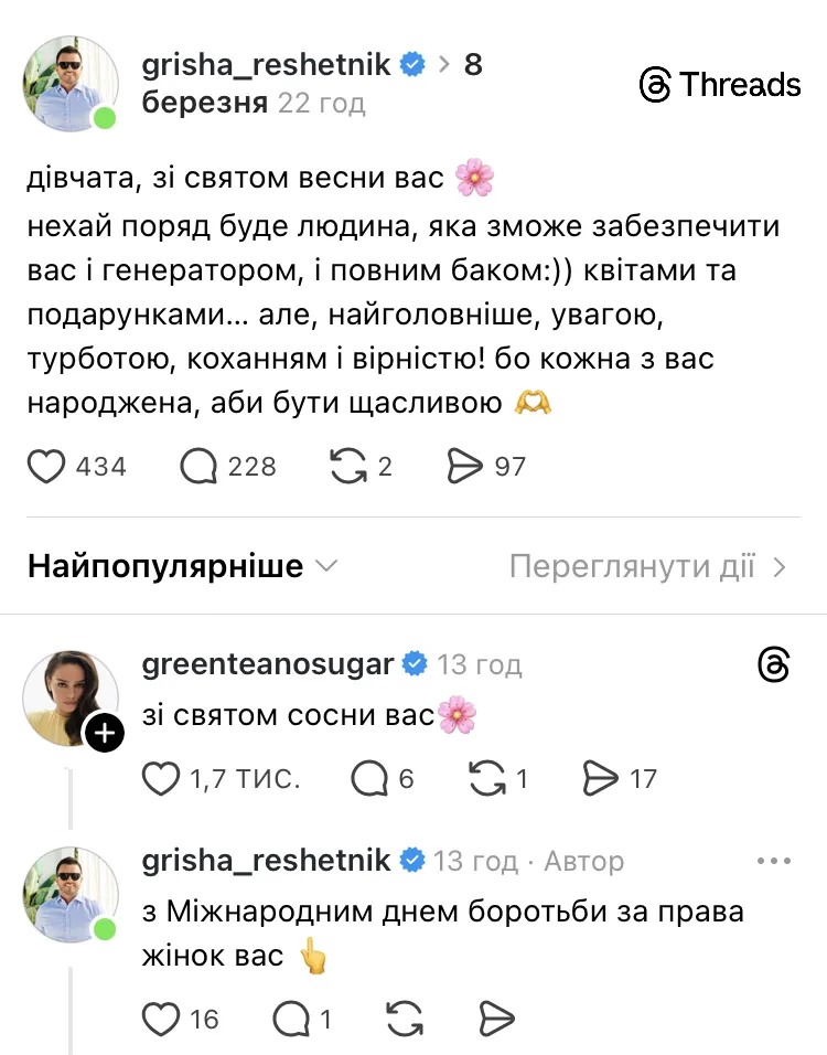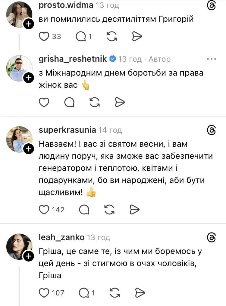 Суперечка виникла у Threads через формулювання, яке ведучий використав у привітанні. "Дівчата, зі святом весни вас. Нехай поряд буде людина, яка зможе забезпечити вас і генератором, і повним баком, квітами та подарунками. Але, найголовніше, увагою, турботою, коханням і вірністю! Бо кожна з вас – народжена, аби бути щасливою", – написав телеведучий.
