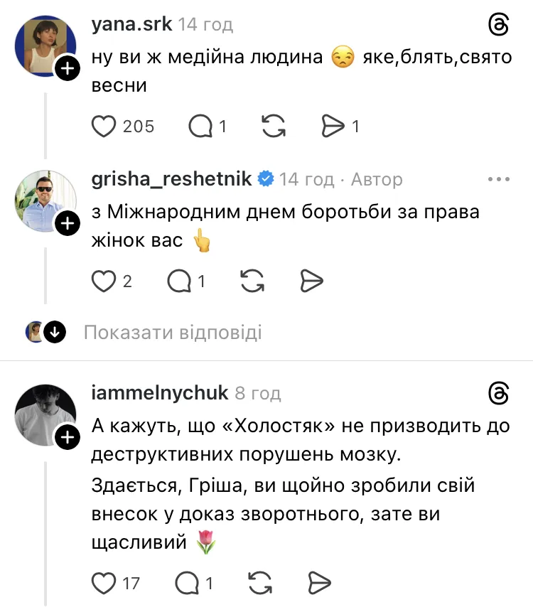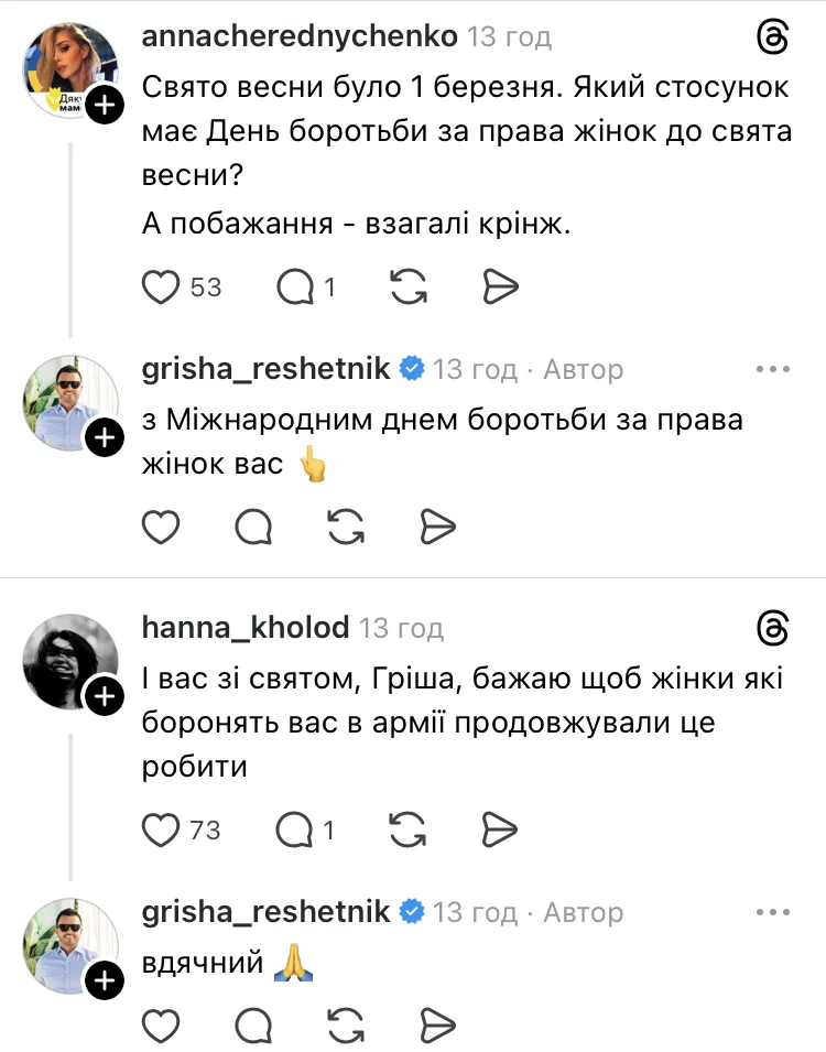 На один із найрізкіших коментарів, де користувач написав: "Грішо, яке свято весни? Може ще свято краси? Ви – медійна людина, не позорьтесь. Не транслюйте совєцьке викривлене сприйняття цього дня", телеведучий вирішив відреагувати окремим дописом.