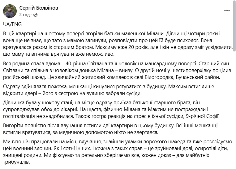 "На щастя, фізично Мілана та Максим не постраждали і госпіталізація не знадобилася. Також гостра реакція на стрес в їхньої сусідки, 9-річної Софії. Вигоріти повністю після влучання встигли дві квартири в цьому будинку. Всі інші мешканці встигли врятуватися, за медичною допомогою ніхто не звертався", – додав Болвінов.