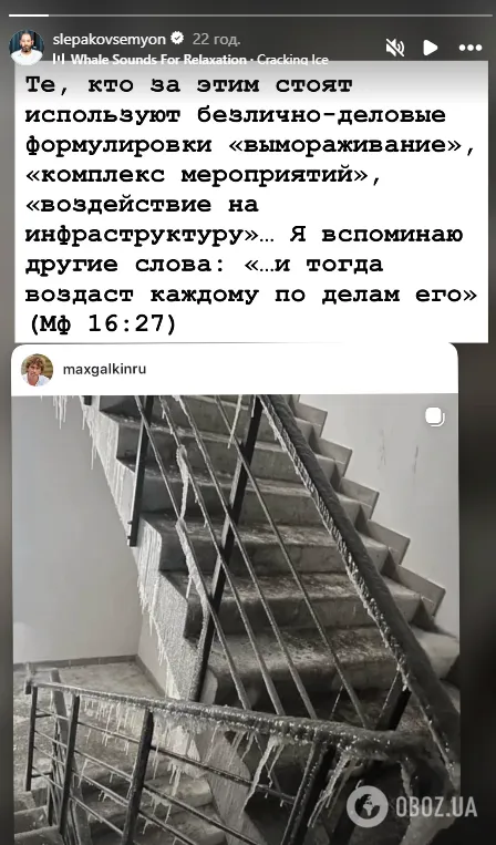 "Ті, хто за цим стоять, використовують безликі ділові формулювання "виморожування", "комплекс заходів", "вплив на інфраструктуру"... Я згадую інші слова: "...і тоді віддасть кожному згідно з ділами його" (МФ 16:27)", – прокоментував Слєпаков.