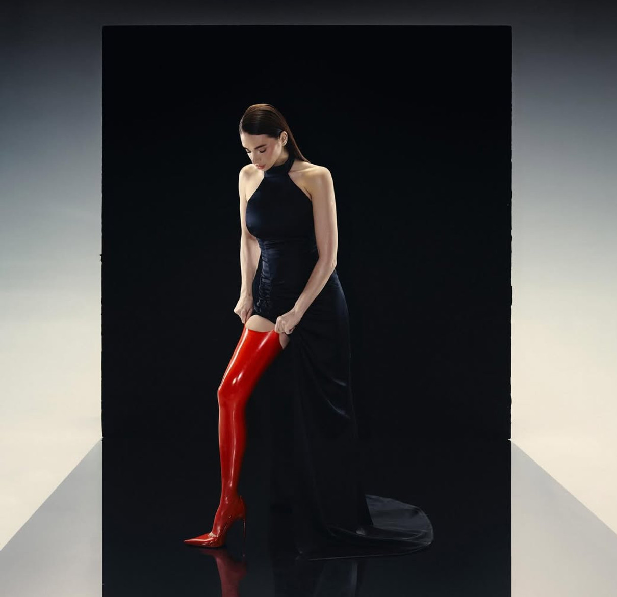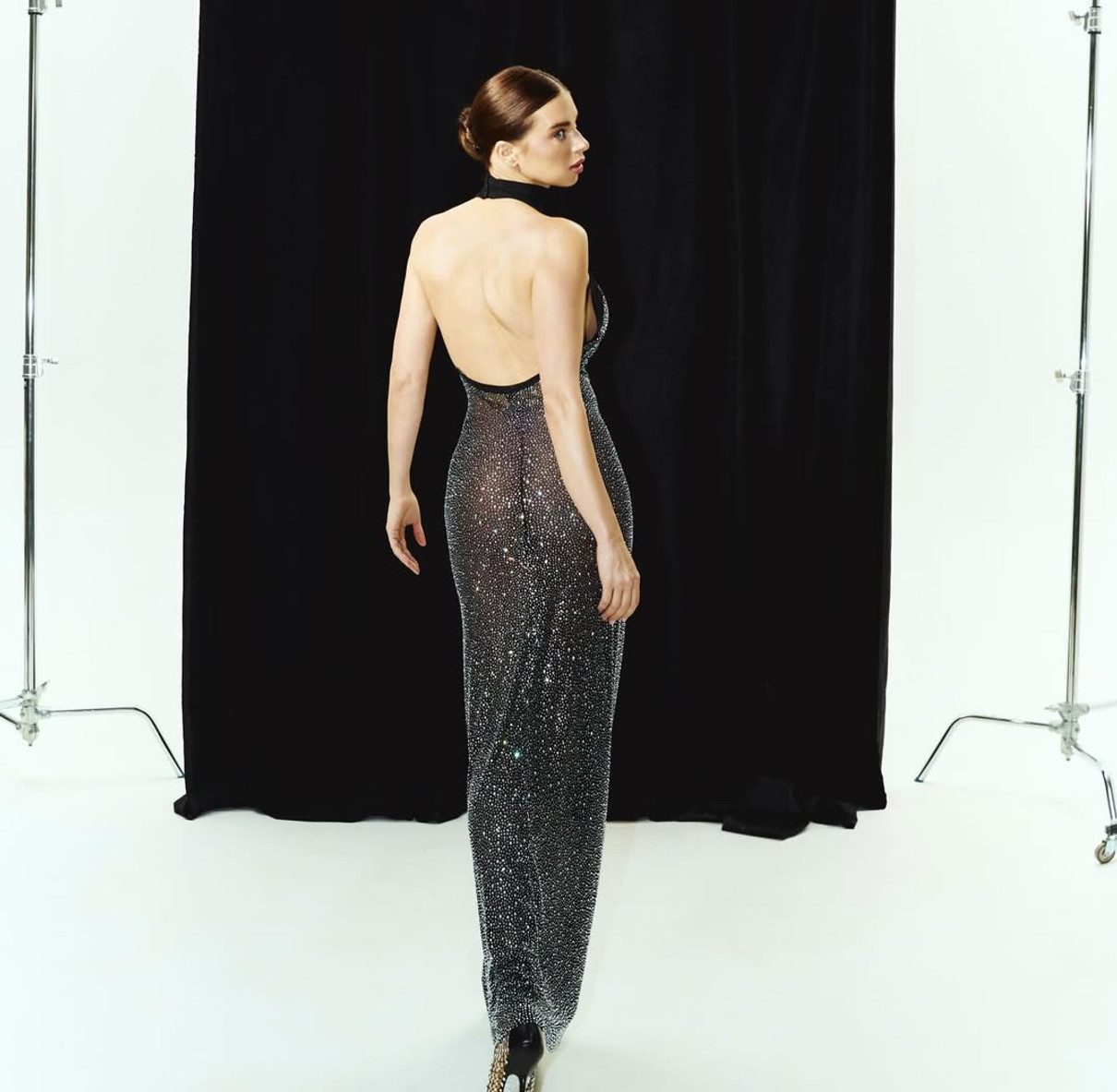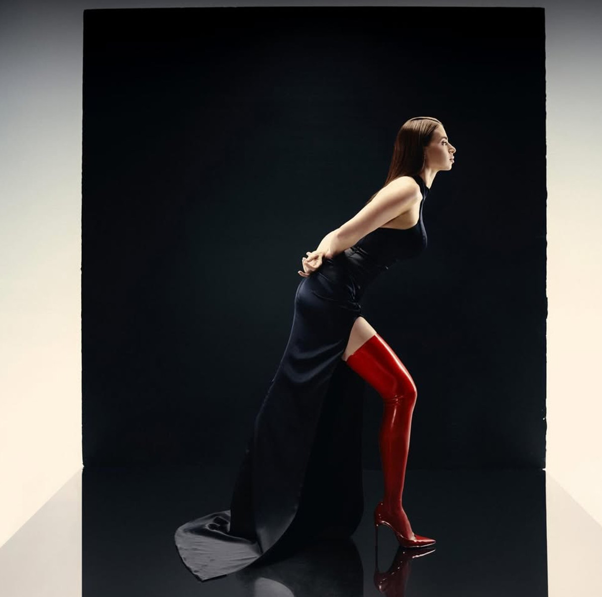 Цього разу обраниця спортсмена постала на стильних фото у декількох спокусливих образах: сукні з розрізом, яка доповнювалася латексним ботфортом, блискучому максі з відкритою спиною та червоному оксамитовому міні.
