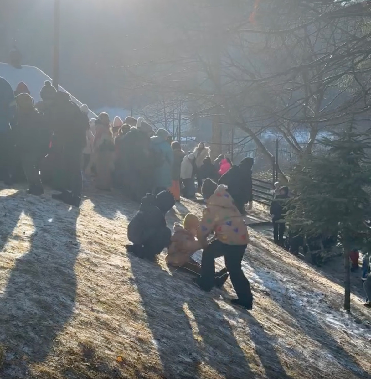 І хоча снігу випало мало, діти все одно намагалися спускатися з гірки